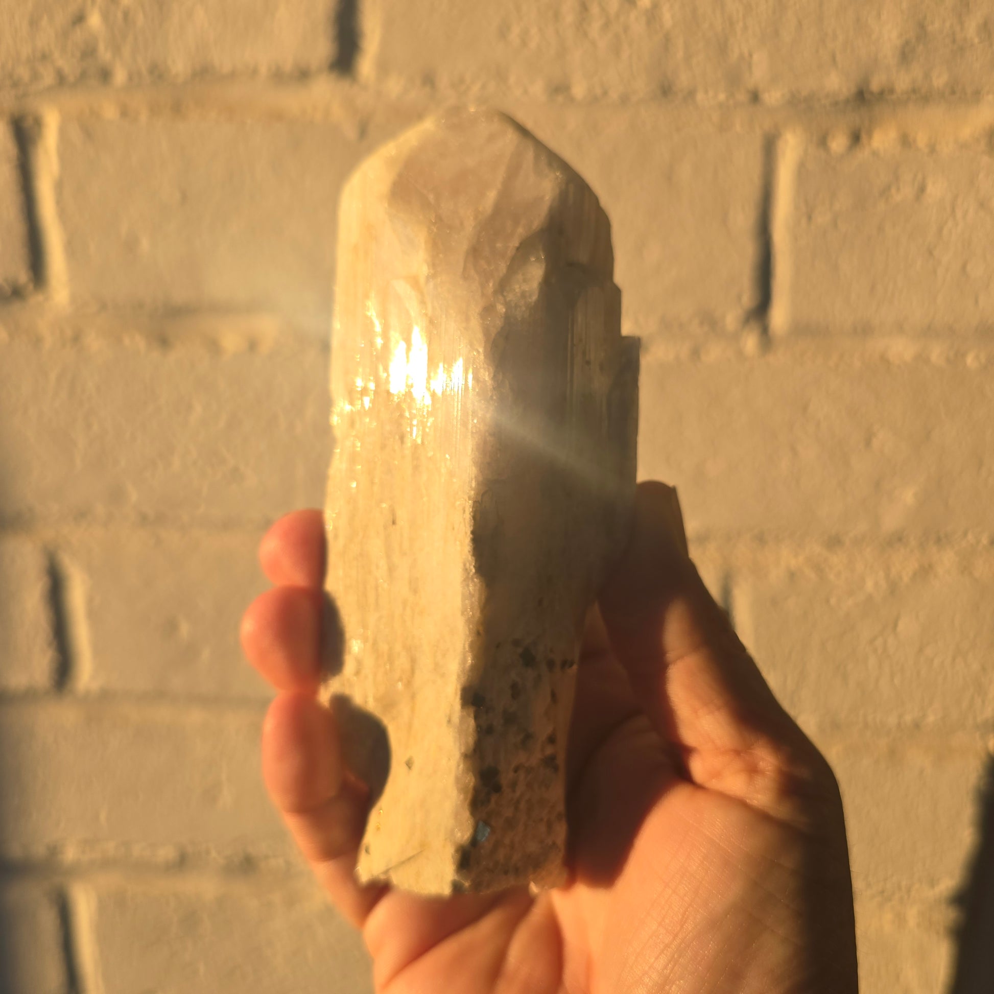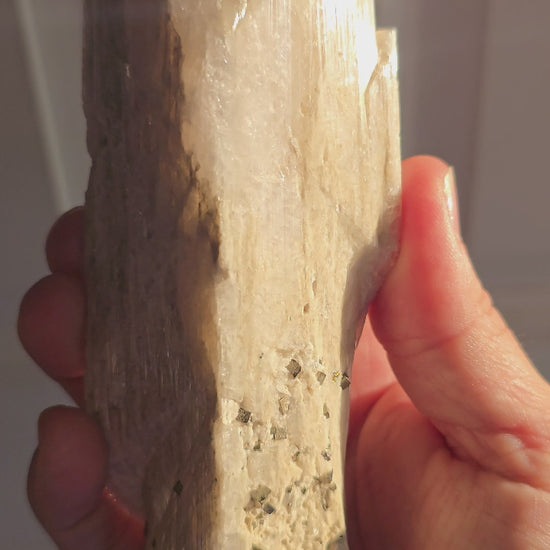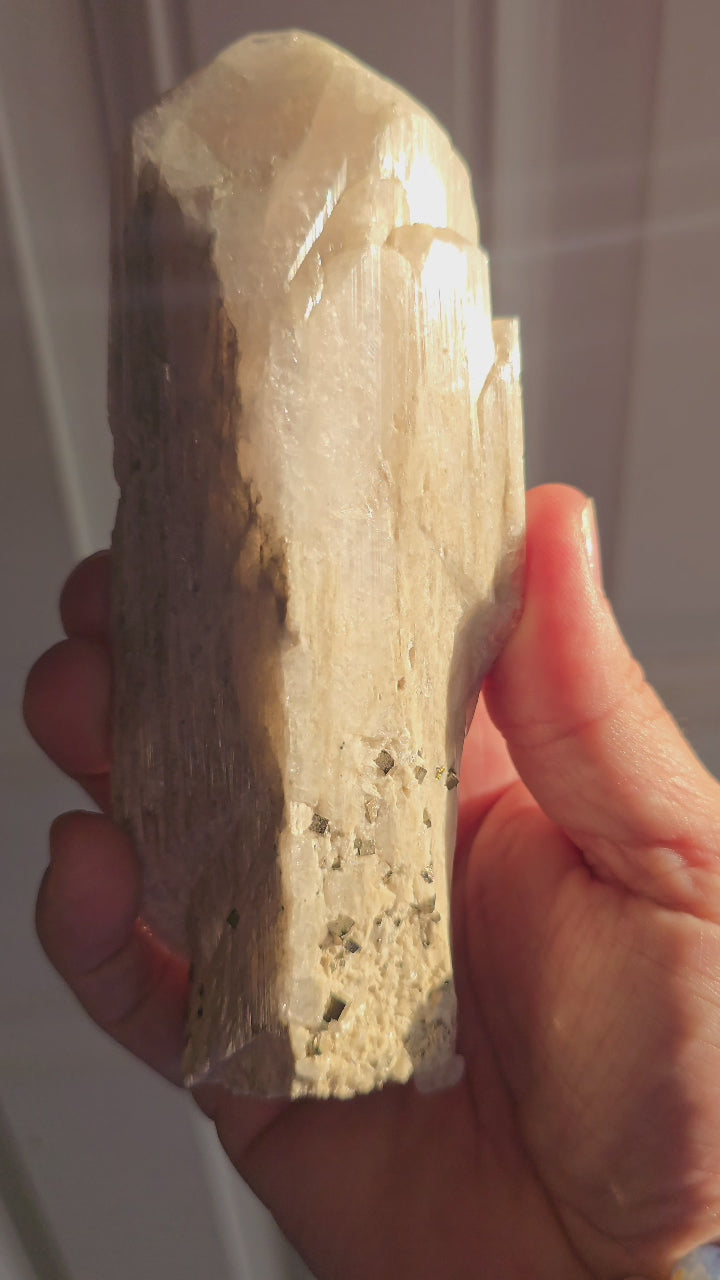 This unique Danburite w pyrite cubes from Mexico comes out of an old collection. Mined over 15 years ago, you don't see many Danburite pieces like this. This piece is approximately 6 1/2x2 1x2 inches and 1 pound. Spiritually, Danburite is known to help communicate w higher realms and beings, help calm anxiety and fears, and your spiritual development.