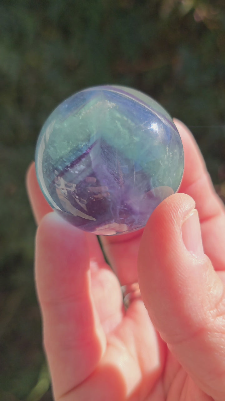 Swirling with teals, greens and purple this Fluorite sphere has a nice polish and amazing phantom inclusions. How could you not want this?! This sphere is approximately 40 mm and 3.6 oz. Spiritually Fluorite is known clearing the energy field, getting rid of negative thoughts and bringing in mental clarity.