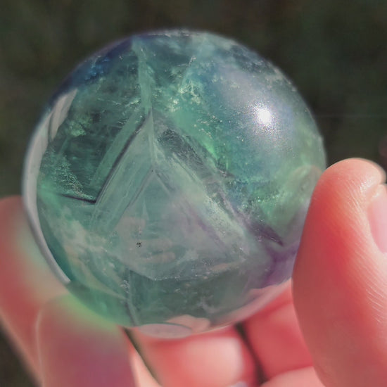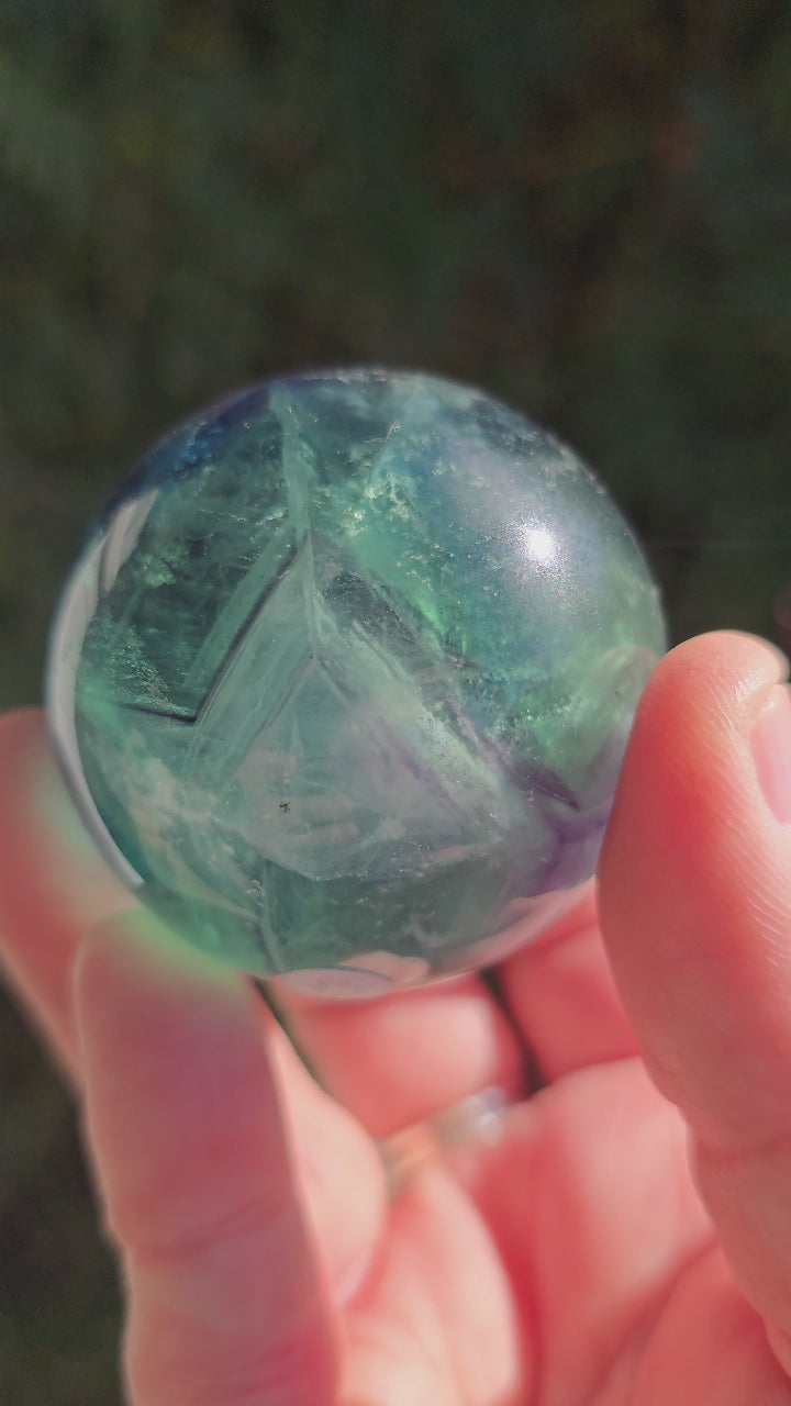 Swirling with teals, greens and purple this Fluorite sphere has a nice polish and amazing phantom inclusions. How could you not want this?! This sphere is approximately 48 mm and 6.7 oz. Spiritually Fluorite is known clearing the energy field, getting rid of negative thoughts and bringing in mental clarity.