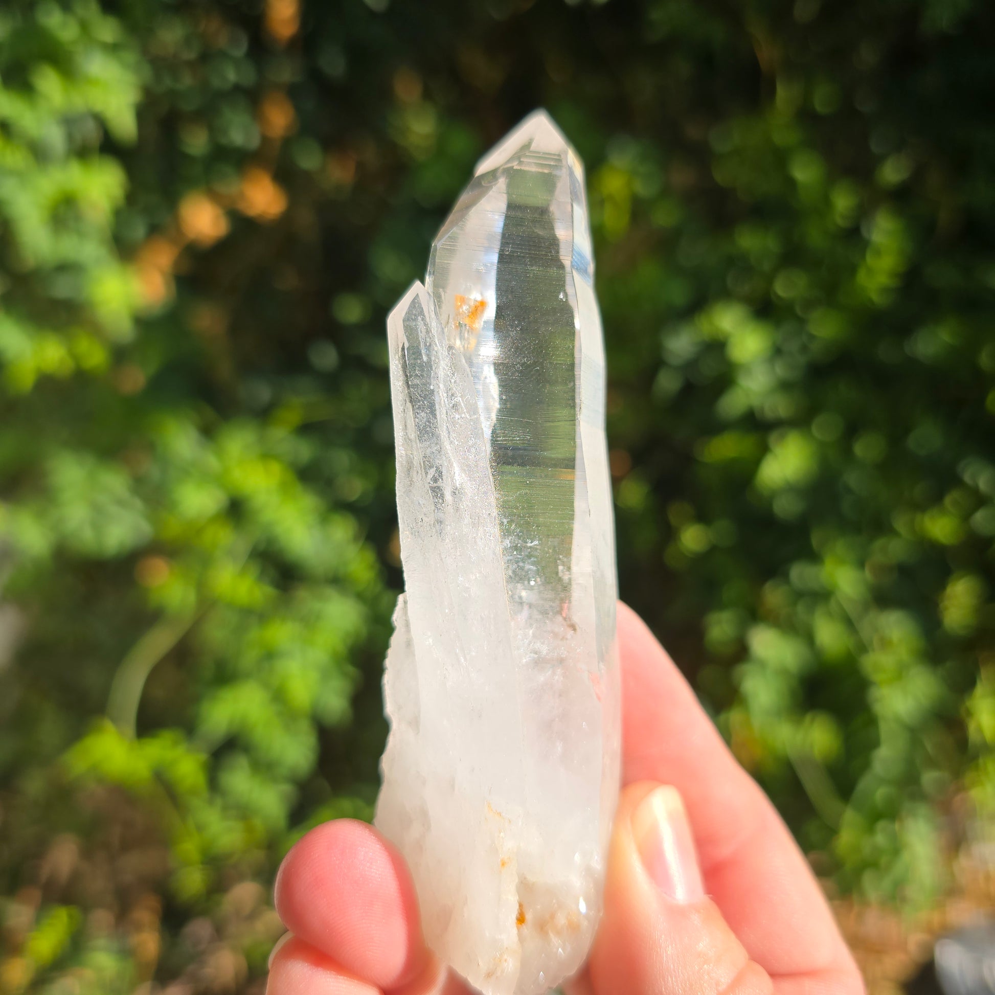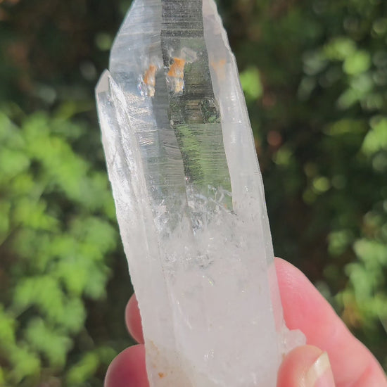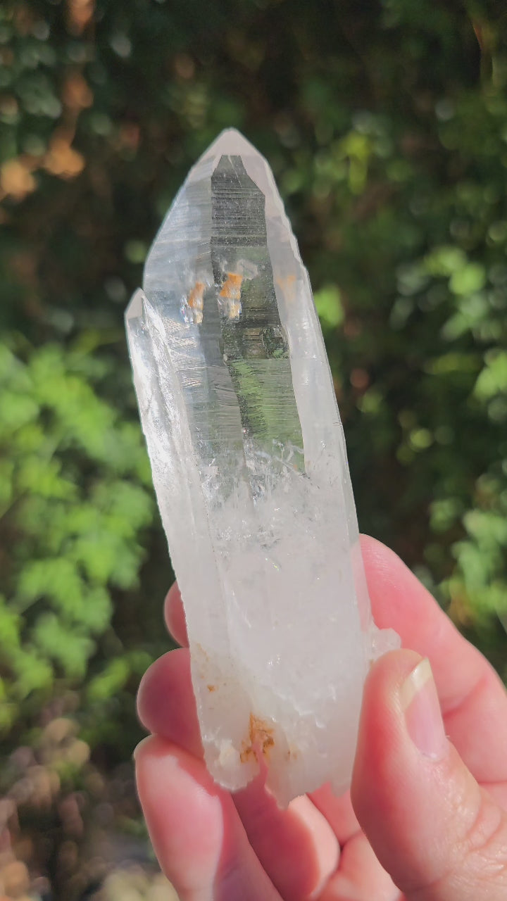 Gorgeous and spectacular is the only way to describe this Colombia Lemurian Quartz w dendritic inclusions, which makes this a unique find. They come out of Satander, Colombia, and an old collection. This beautiful piece is approximately 4 1/2 inches by 1 1/2 inches. Weighs in at 6 oz. Spiritually, Colombian Lemurians are known as a super powerful and vibrational crystal. They are believed to hold ancient knowledge & wisdom of the ancient Lemuria civilization, and while meditating with them, you may access that information left etched inside these amazing quartz. Also known to enhance your psychic abilities, emotional healer, and last but not least, help you get in touch with higher realms & spirit guides. You will receive this exact specimen.