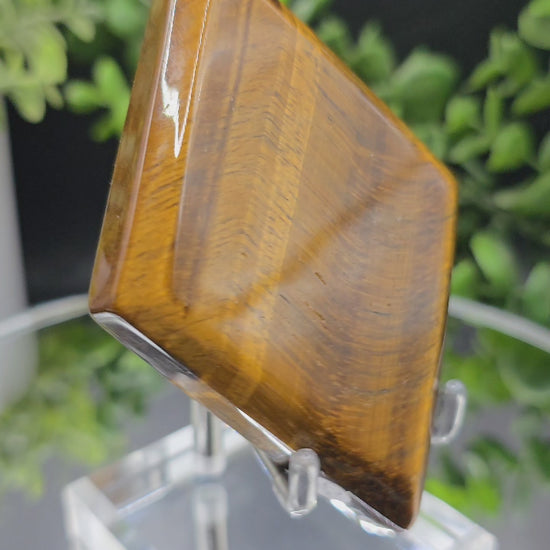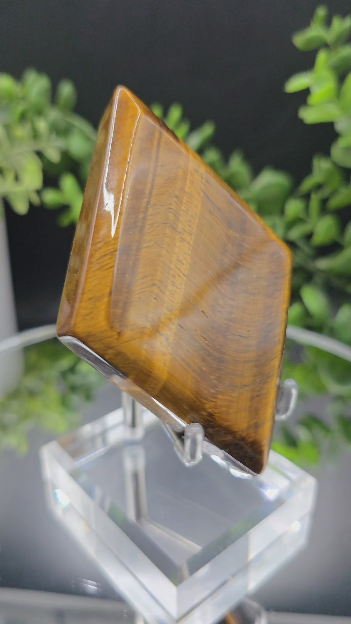 This Tigers eye diamond is a great esthetically pleasing piece w really nice chatoyance. This piece is approximately 3 1/1x2 1/2 inches and 4 oz. Spiritually, Tigers eye is known to help keep evil eyes away and helps balance your extremes. The ying and yang in your emotions. It is also known to help you unstuck in situations